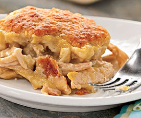 2. In a medium bowl, combine flour and pepper; stir in buttermilk and butter. Pour over chicken (do not stir); smooth top.