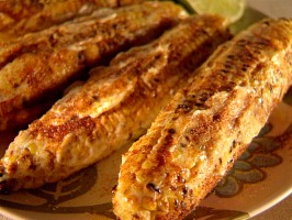Rub corn with oil and place on the grill pan, turning corn so all sides are charred, about 6 to 10 minutes.