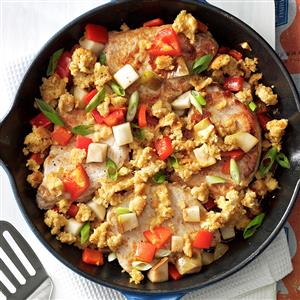 Top with stuffing and onions. Cook, uncovered, over medium heat for 8-10 minutes or until a thermometer reads 145°.