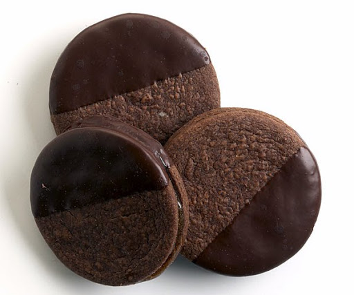 The Sacher torte—chocolate sponge cake layered with apricot jam and covered in dark chocolate icing—is re-interpreted in this recipe as cakey cookies filled with preserves and dipped in bittersweet chocolate.