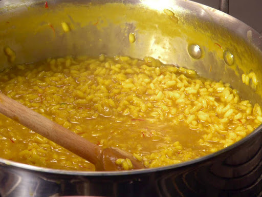 Repeat this process two more times with the hot saffron chicken stock. When the third addition of the stock has absorbed and the rice is very creamy, bite a couple grains of rice to be sure it is cooked perfectly. If it is still a little crunchy, add a little more stock and cook the rice for another couple of minutes. When the rice is cooked perfectly, remove it from the heat.