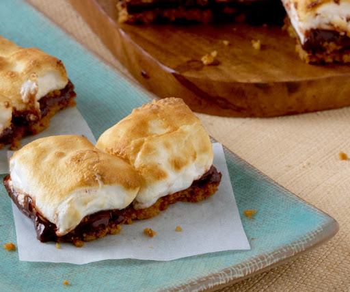 Just before serving, adjust the oven rack to the top level and heat the broiler on high. Using the excess foil as handles, lift the s'more square from the pan and set on a cookie sheet. Pull the foil away from the sides and slide the cookie sheet under the broiler. Broil until the marshmallows are browned, about 20 seconds. Set on a rack and move the foil and s'more square to a cutting board. Cut into 18 rectangles. Serve immediately or cover and refrigerate for up to 2 days. Serve slightly chilled.