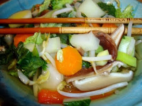 In a nabe or ceramic pot that is safe for use on the stovetop (or use a regular pot), bring 2-3 cups water and the mushroom soaking liquid to a boil. Add the kombu and mushrooms and lower the heat so the water is simmering. Begin adding the vegetables one at a time, starting with the carrots and other vegetables that take longer to cook. Most of the vegetables shouldn't take longer than 2 minutes. You want them fresh and light, not mushy or overcooked.