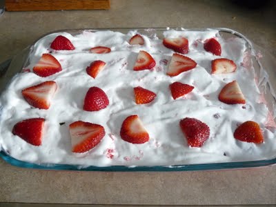 Tear angel food cake into chunks and place in bottom of 13 x 9" dish. Prepare pudding as directed on box and spoon over cake. Mix Jello with boiling water and stir until completely dissolved, then pour over frozen strawberries. After strawberries have thawed, pour over cake and pudding. Top with Cool Whip. Decorate with fresh strawberries. Refrigerate.