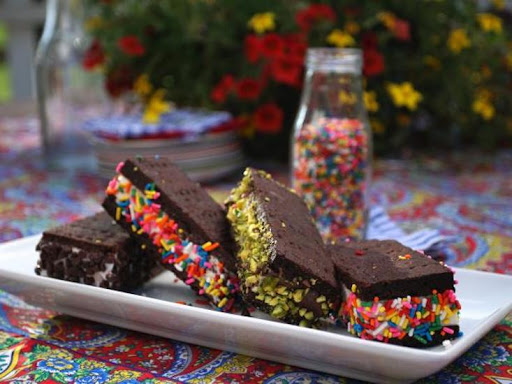 Run a sharp knife under hot water and dry completely. Using the hot knife, cut the large ice cream sandwich into 12 individual sandwiches. Put sprinkles, chopped pistachios, and chocolate chips in separate plates. Coat the edges of the sandwiches in the garnish of your choosing. Serve immediately or freeze until ready to eat.