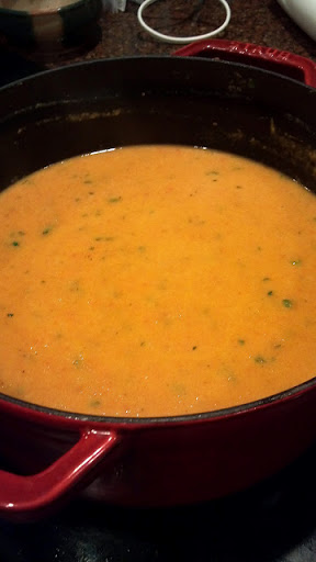 Add 4 cups of the chicken broth to a saucepan and bring to a simmer. Pop the garlic out of their skins and add to the sauce pan with the roasted carrots and onions. Simmer everything together for 15 minutes. Add the basil at the very end of cooking. Puree until smooth by adding in batches to a blender or by using an immersion blender. Add the remaining broth, a little at a time, when pureeing to loosen it up a bit.