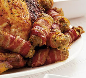 2. Set aside about one third of the stuffing for the turkey and divide the rest into 20 pieces. Mould each piece into a little finger-sized sausage, then wrap each one in a rasher of bacon. Put the sausages into a shallow ovenproof dish, ready for roasting (see Citrus & thyme turkey).