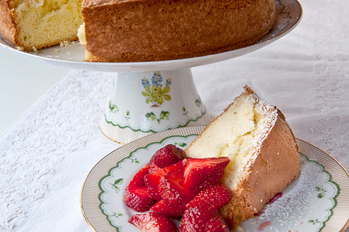 *Using* the stand mixer with whisk attachment for all, *beat* the whites to stiff peaks, at least five minutes. *Beat* in the yolks, one by one. *Continuing* to beat, add the sugar and vanilla, and finally the flour. *You should have* a very high, mousse-like batter. *Pour* the batter into the pan and bake until golden on top, risen high, and a toothpick inserted in the centre comes out clean, about 25 minutes. (Cover loosely with a piece of foil after five to ten minutes [once it's risen] to avoid a burned top)