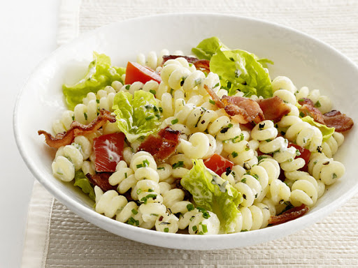 Mix the mayonnaise, sour cream and 3 tablespoons chives with the pasta until evenly combined. Season with salt and pepper. Add the lettuce; toss again to coat. Garnish with the reserved bacon and the remaining 1 tablespoon chives. Serve at room temperature.