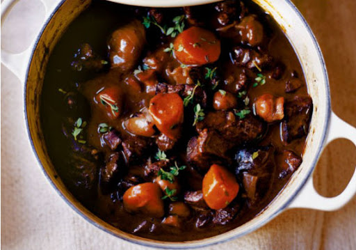 Heat oven to 350°F. Fry the vegetables in a little oil and butter in a heavy-based casserole for four to five minutes until golden. Tip in the garlic and fry for a further minute, then set aside. Put the venison into a plastic bag with seasoned flour and shake to coat. Add a little more oil and butter to the pan, then fry the venison over a high heat, stirring now and then, until well browned. Don't crowd the pan — cook in batches if necessary. Set aside with the vegetables. Add the red currant jelly and wine to the pan, and bring to the boil. Pour in the stock, then add the thyme, bay leaf, meat and vegetables. Season to taste and bring to a boil. Cover and transfer to the oven for about one-and-a-half hours or until tender. Remove from the oven and check the seasoning.