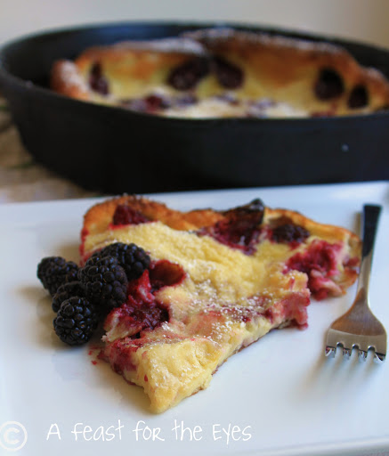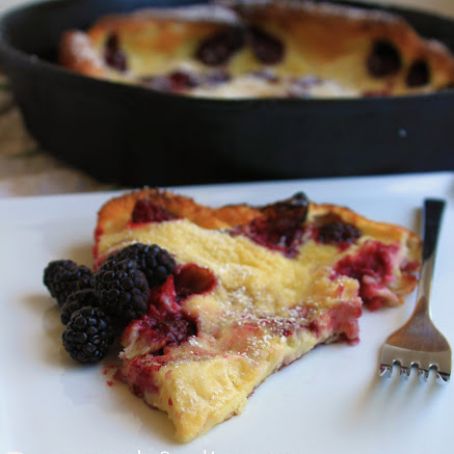 A quick batter of flour, milk, eggs and vanilla is poured over Summer Olallieberries (or any berry) and baked at high heat. The pancake puffs up to a beautiful golden brown. Add a squeeze of lemon juice and powdered sugar— and you have a delicious and very quick breakfast dish!