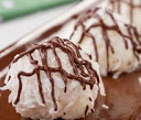 Place chocolate chips in a small heavy-duty, zip-top plastic bag; seal. Submerge in hot water until chocolate melts. Snip a tiny hole in 1 corner of bag, and drizzle chocolate over coconut balls. Let candies stand until firm; store in refrigerator.