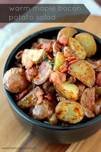 Warm Maple Bacon Potato Salad: the best kind of salad! Crispy roasted potatoes with a smoky, sweet, tangy vinaigrette. www.thereciperebel.com