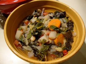 Add the carrots, potatoes, cabbage, Swiss chard, kale, the pureed bean mixture, and an additional 2 cups of water or stock. Season with salt and pepper to taste. Cover, and cook until the potatoes are fork-tender, about 20 minutes, stirring at least once.