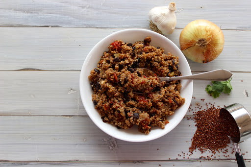 In a large skillet add olive oil, turn to medium-low heat and saute diced onions until tender, about 4 minutes, add garlic and saute one additional minute. Add the remaining ingredients in the order listed above. Cover, bring to a boil, reduce heat to a low boil and cook 15-20 minutes or until liquid is absorbed. Remove from heat and allow to sit 5 minutes covered before serving. Fluff quinoa with a large spoon and serve.