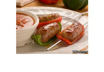 Place a piece of sausage in the natural curve of a pepper strip. Push skewer gently through one end of the pepper then the sausage then the other end of the pepper, with the pepper surrounding the sausage on three sides. Place on a rimmed baking sheet. Repeat with remaining peppers and sausage.