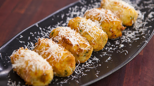Boil the potatoes in their skins until tender. Leave to cool slightly, then peel and press through a ricer while still hot. When cool transfer it to a large bowl and add the egg yolks, parmesan, mozzerella, pecorino, parsley, ham, salt, pepper and mix to combine