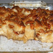 Sure to please, this bread pudding delights with cinnamon, heavy cream and lots of vanilla! The praline sauce recipe makes lots - and you’ll be happy!