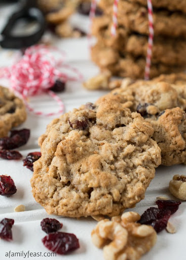 In the bowl of a stand mixer, beat shortening and both sugars at medium speed until completely mixed. Add eggs and vanilla mix well. Add flour mixture and mix until completely combined and smooth. On low speed or by hand, stir in oats, dried cranberries and walnuts.