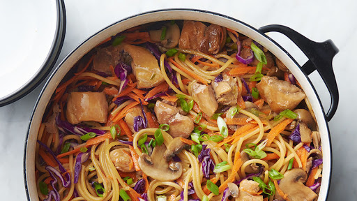 Add remaining 2 tablespoons oil to skillet, then stir in mushrooms and green onion whites. Cook over medium-high heat 5 to 7 minutes, stirring frequently, until softened. Stir in broth, carrots, cabbage, oyster sauce, soy sauce and ginger. Heat to boiling over high heat. Stir in chicken and spaghetti; return to simmering, then reduce heat and simmer uncovered 14 to 16 minutes, stirring frequently, until spaghetti is cooked through and sauce is thickened.
