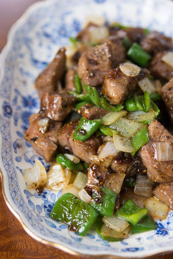 Heat a wok or cast iron skillet over high heat until hot. Add the oil, and then immediately add the beef, leaving any marinade in the bowl for later. Fry one side until browned, and then use a hard spatula to stir-fry until the outside of the beef is cooked and browned. Add the garlic, bell peppers, and onions, and continue stir-frying. Add the remaining marinade and stir-fry until the onions are cooked.