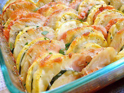 STEP 3: Spray the inside of an 8x8 square or round baking dish with non-stick spray. Spread the softened onion and garlic in the bottom of the dish. Place the thinly sliced vegetables in the baking dish vertically, in an alternating pattern. Sprinkle generously with salt, pepper, and thyme.