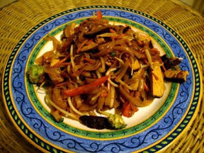 Add the sugar, soy sauce, tamarind liquid, vinegar, and paprika or chili powder. Stir-fry the mixutre until thoroughly combined and liquid is absorbed. Stir in the tofu and preserved turnips. Check the noodle texture; it should be cooked and soft. Add some water if the noodles are too dry or too tough. (If they fall apart easily, they are overcooked. But this wasn't an issue for me, I think because I didn't over "cook" them in the warm water.)