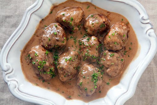 9 To finish, move the meatballs to a serving dish. Add the sour cream and mix well. Either add the lingonberry jelly to the sauce or serve it on the side.