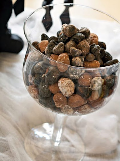Unsweetened cocoa powder and powdered sugar provide the "dusty" finish to miniature marshmallows and semisweet chocolate pieces in this darling snack that really does look like gravel. Suitable for decorating a "graveyard" cake or resting by an ominous monster, this treat will help you create a Halloween mood. Feel free to make your own additions to this recipe, such as chocolate-covered nuts, slightly warmed so the cocoa and powdered sugar will adhere.