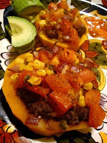 Mash cooked black beans with a fork. Divide evenly, and press into squash shells. Top with diced ingredients and a sprinkling of adobo seasoning.