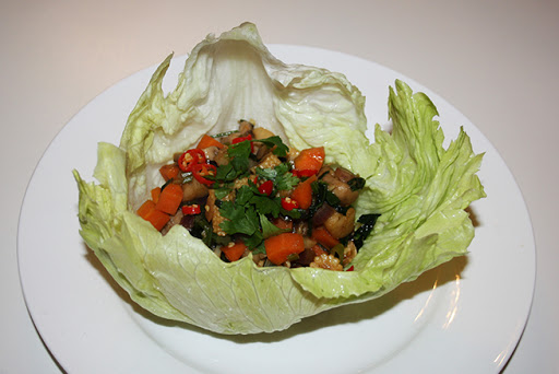 2.)    Take the whole ice berg lettuce and remove any extra leaves on the outside. Remove the core and run cold water down the centre of the lettuce and allow to sit for a minute. The water gently separates the leaves. Peel off lettuce leaves one at a time and trim if desired. Serve the mixture inside the lettuce leaves with some sesame seeds and coriander leaves.