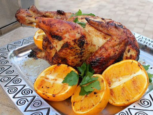 Before serving, squeeze 2 of the orange halves over tops of chickens; serve others on the side