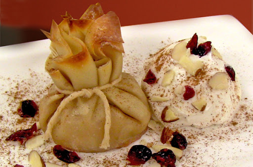 Brush pouches with the melted butter set aside earlier. Bake until wrappers are golden brown 12 to 15 minutes. Garnish with dried cranberries, nuts, and cinnamon sugar, and enjoy with ice cream.