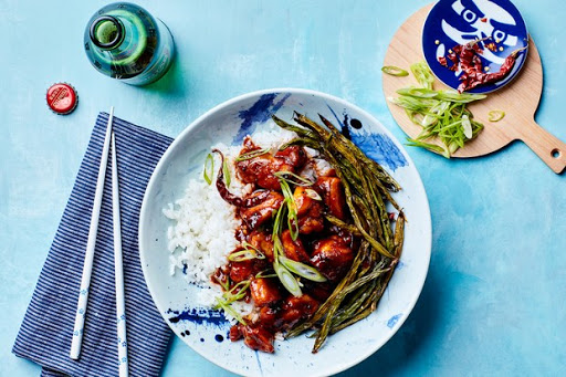 Divide chicken and green beans among plates. Top with scallions. Serve with rice alongside.