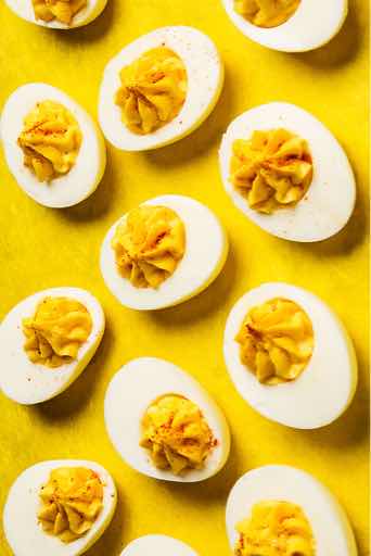 Remove shells from eggs and halve lengthwise. Carefully remove yolks and place in bowl. Mash yolks with fork and add remaining ingredients except paprika; mix until fluffy. Fill egg white halves with mixture and sprinkle with paprika.