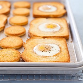You will need two heavy-bottomed rimmed baking sheets; our favorite is the Wear-Ever Half Size Heavy Duty Sheet Pan (13 Gauge) by Vollrath. If you don’t have a biscuit cutter, cut the toast holes with a sturdy drinking glass.