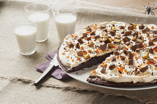 Prepare brownie batter as directed on package; spread onto bottom of 12-inch pizza pan sprayed with cooking spray. Bake 15 min. or until toothpick inserted in centre comes out with fudgy crumbs. (Do not overbake.) Cool 30 min.