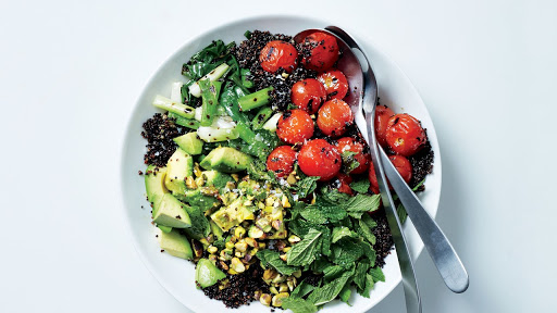 Spoon quinoa onto a platter and top with scallions, tomatoes, avocado, mint, and pistachios. Drizzle with oil and sprinkle with sea salt.
