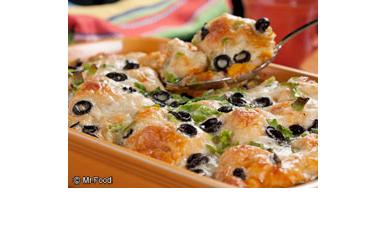 Spoon mixture into prepared baking dish. Sprinkle with cheese, bell pepper, scallions, and olives.