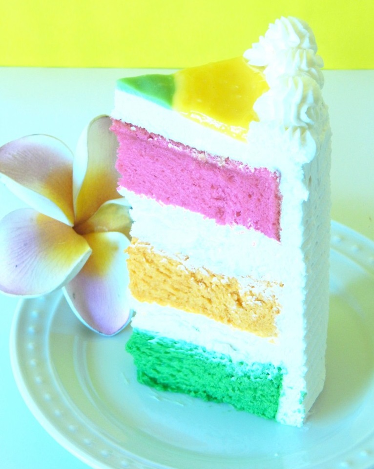 In each separate bowl of batter, add one kind of nectar/juice. Once mixed in, you will need to add the food coloring- green for the lime layer, orange for the passion fruit layer and red or pink for the guava layer. Use your own judgment on how many food coloring drops to use and bear in mind that you will be adding eggs whites later which will lighten the batter.