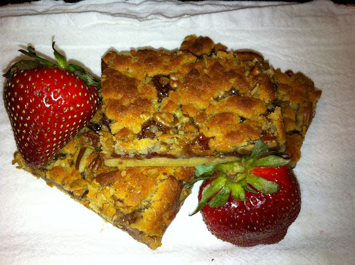 Sift the flour and salt and whey protein together, with the mixer on low, slowly add to the butter mixture, mixing until it almost comes together in a ball. Turn the dough into glass dish. Lightly pat two-thirds of the dough evenly on the bottom of a 9-inch square baking pan and about 1/4-inch up the sides. Spread with the jam, leaving a 1/4-inch border. Mix the granola and pecans into the remaining dough. Break the dough into small bits and distribute it on top of the jam, covering most of the surface. Bake the bars for 25 minutes, until lightly browned.