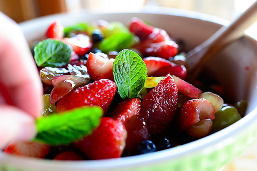 Mix together all the fruit in a large bowl and pour the syrup over the top, tossing gently. Garnish with mint leaves and serve.