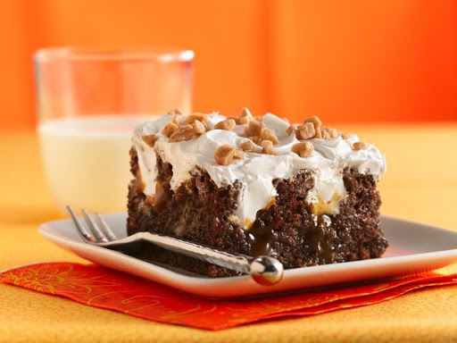 This cake is full of holes! But that's okay - you fill them with sweetened condensed milk and caramel sauce. Top with whipped topping for the yum!