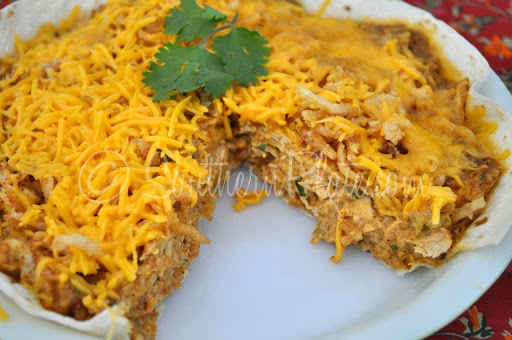 Line a pie plate with remaining tortilla and spoon mixture into it. Place in microwave for five minutes.* Remove and top with remaining onions and cheese. Microwave for one minute more, or until cheese is melted. Enjoy!