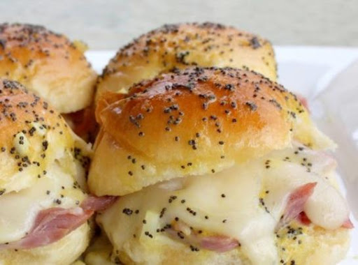 Cut the rolls in half horizontally, removing the tops and placing the bottoms on a foil-lined baking sheet. Place a spoonful of sauce on each roll, followed by a slice of ham and piece of cheese. Place a roll top on each. Move the sliders closely together. Slowly pour the remaining sauce right over the tops of these small beauties.