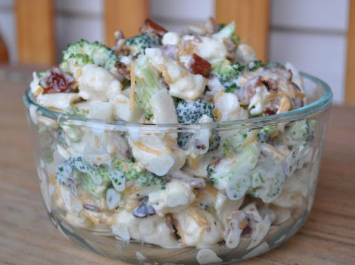 Add the dressing to the broccoli–cauliflower mix, stirring to evenly coat the vegetables. Stir in the bacon and the cheese, reserving a small amount to sprinkle on top of the salad just before serving.