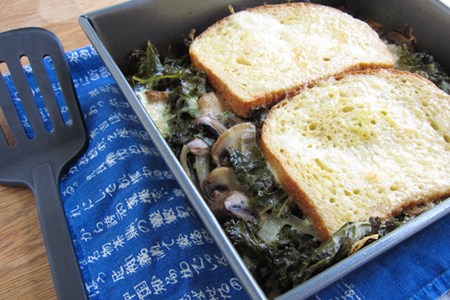Transfer kale mixture to baking pan. Layer bread on top of the kale and pour the milk and egg over the top. Sprinkle on the cheddar cheese. Cover and bake for 15 minutes.
