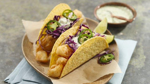 3 Fill each taco shell with fish, cabbage, a dollop of aioli and chiles. Serve with lime wedges.