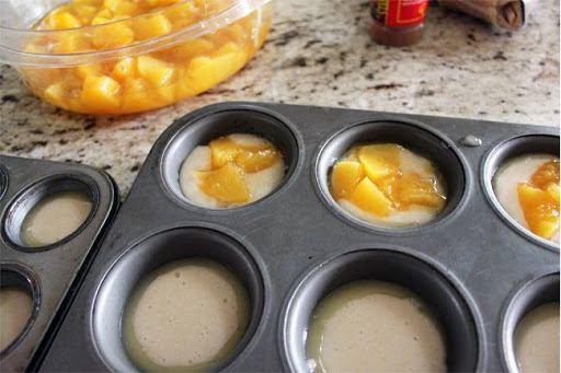 Add 1 tablespoon diced peaches on top of the batter. Sprinkle with brown sugar and then cinnamon.