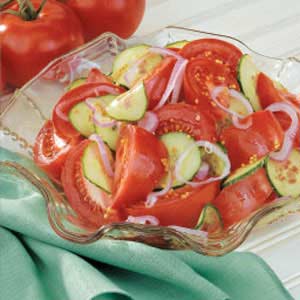 Pour over tomatoes and onion; toss to coat. Cover and refrigerate for at least 2 hours. Add cucumber; toss to coat. Refrigerate overnight. Serve with a slotted spoon. Yield: 8 servings.